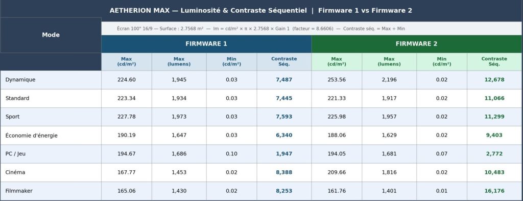 Let us start with the comparative table between the two firmwares, which is highly instructive. Before commenting on the figures, one important clarification is necessary: the brightness progression observed between the two firmwares on certain modes is not the result of software optimisation at constant laser power. It is explained by a change in laser power level between the two measurement sessions, Dynamic mode having been measured at level 8 with the first firmware and at level 10 with the second, with Cinema mode having undergone the same parameter change. This distinction matters: comparing these figures directly without mentioning it would give a distorted picture of what the second firmware actually contributes in terms of brightness. The sequential contrast progressions, on the other hand, are genuinely attributable to firmware improvements, as they are driven primarily by an improvement in black level most notably Filmmaker mode, whose sequential contrast jumps from 8,253:1 to 16,176:1 thanks to a black level descending to 0.01 cd/m², and Dynamic mode, whose contrast moves from 7,487:1 to 12,678:1 for the same reason. PC/Game mode presents a particular behaviour: its black level actually rises slightly from 0.10 to 0.07 cd/m², which influences its sequential contrast, moving from 1,947:1 to 2,772:1, a value that remains the lowest of all modes, consistent with the deactivation of contrast management systems in this responsiveness-oriented mode.