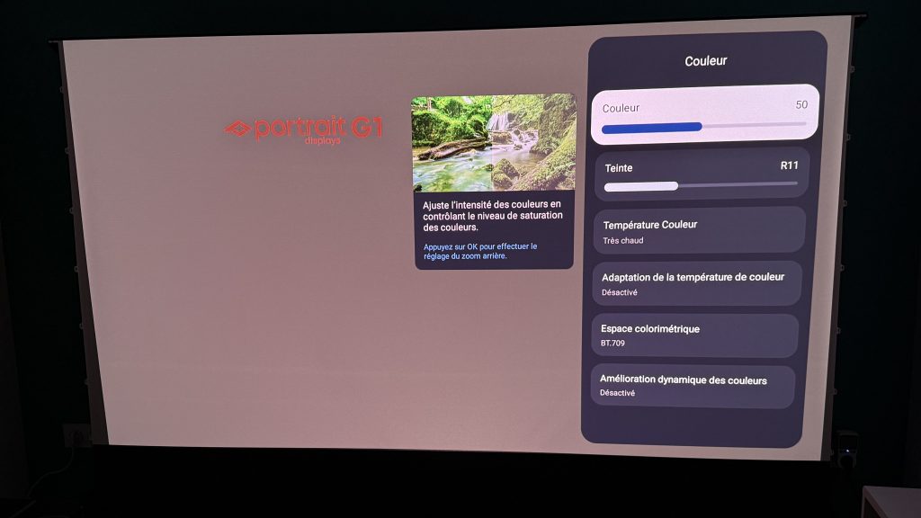 AWOL a par ailleurs anticipé un écueil bien connu des utilisateurs de projecteurs à contraste dynamique : les dérives colorimétriques induites par le fonctionnement de l'iris et de l'EBL, qui peuvent provoquer un glissement de la balance des blancs vers des teintes trop vertes ou trop rouges selon les scènes. Pour y remédier, une option de correction de teinte dédiée est intégrée aux menus, offrant une vingtaine de niveaux d'ajustement une approche que l'on a déjà vue chez XGIMI sur le Titan, et dont on ne peut que saluer la présence ici tant elle répond à un besoin réel.