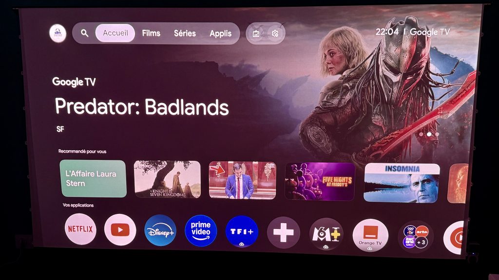 L'Aetherion Max fonctionne sous Google TV pour tout ce qui concerne le streaming direct, le magasin d'applications Android et la lecture de médias depuis le réseau local ou les ports USB. Rien de bien révolutionnaire dans un monde où la quasi-totalité des projecteurs connectés du marché ont adopté cette solution qui, rappelons le au passage, adore vos données personnelles. Passons donc rapidement sur ce chapitre et intéressons-nous plutôt à ce qui constitue le véritable cœur de métier de cet appareil : ses menus dédiés au projecteur, remarquablement riches et dont je vais vous livrer les grandes lignes, en me concentrant sur ce qui m'importe le plus, à savoir les fonctions de calibrage des couleurs.